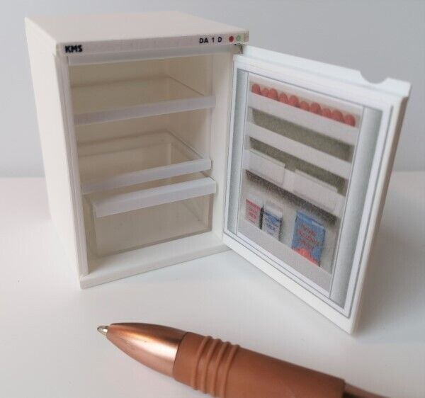 1/12th Scale White Domestic Refrigerator For your dolls house. Door opens to reveal two 'glass' shelves and a salad box, which gives you lots of display space for items from our pre-packed food range!