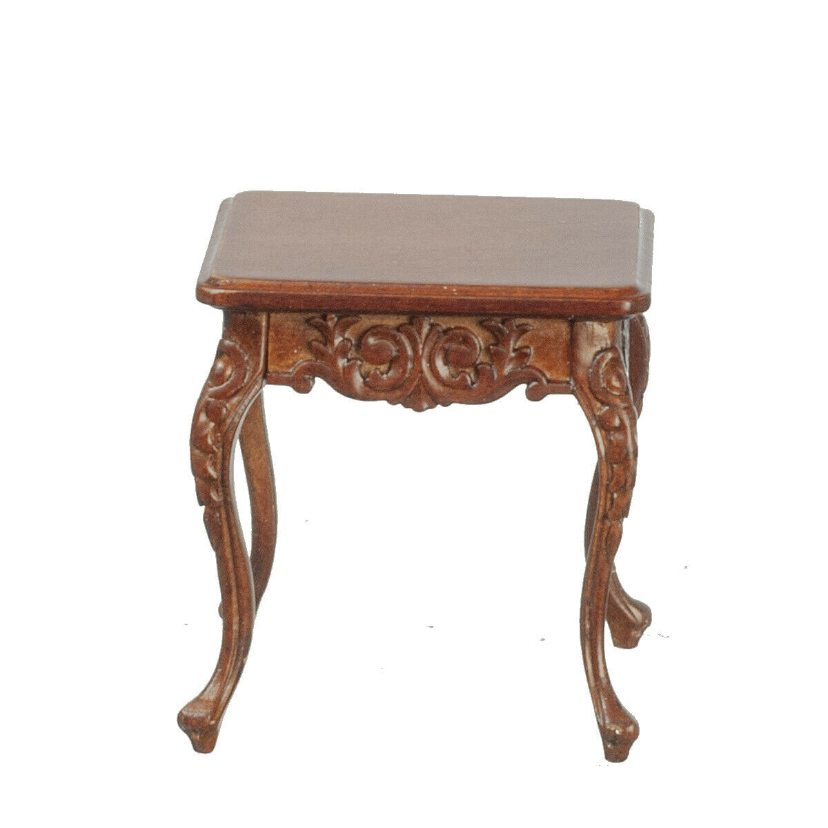 Queen Anne style square side table with detailed Victorian style design, carving on the table apron and signature queen Anne legs. The table top has an ogee edge and the table measures 2 inches long x 2 inches wide x 2 1/16 inches high and is available in a walnut finish.
