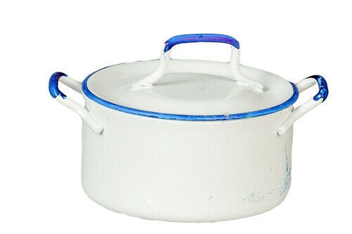 White pot with blue trim and 2 handles