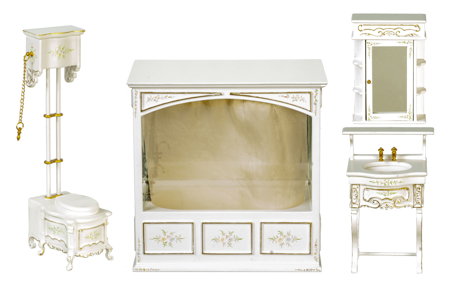 Enclosed Bath/Shower were common in Victorian times when a bath was an addition to the house and had to be installed often in a hallway or at the top of the stairs if there was room. This bath has taps and a shower head and a shower curtain has been added for extra privacy for the occupant. The bath surround measures 5 1/2 inches long x 3 inches wide X 5 1/2 inches high and is available painted white, decorated with hand painted flowers and has a shower curtain included.