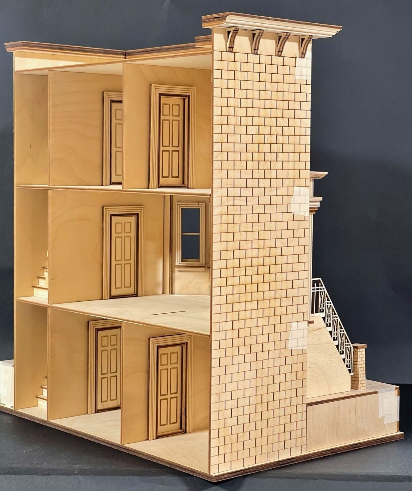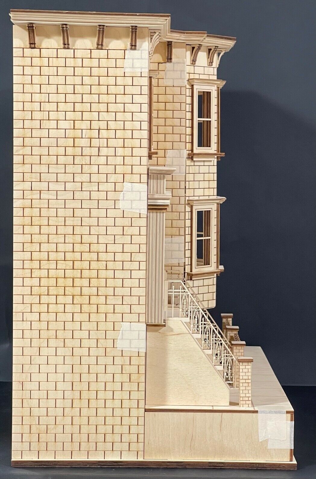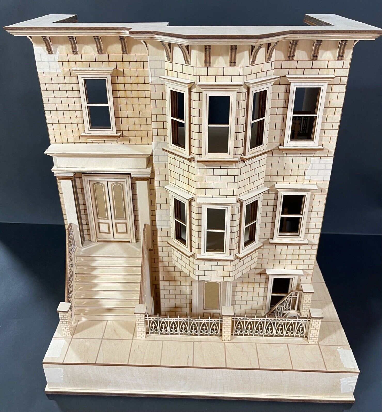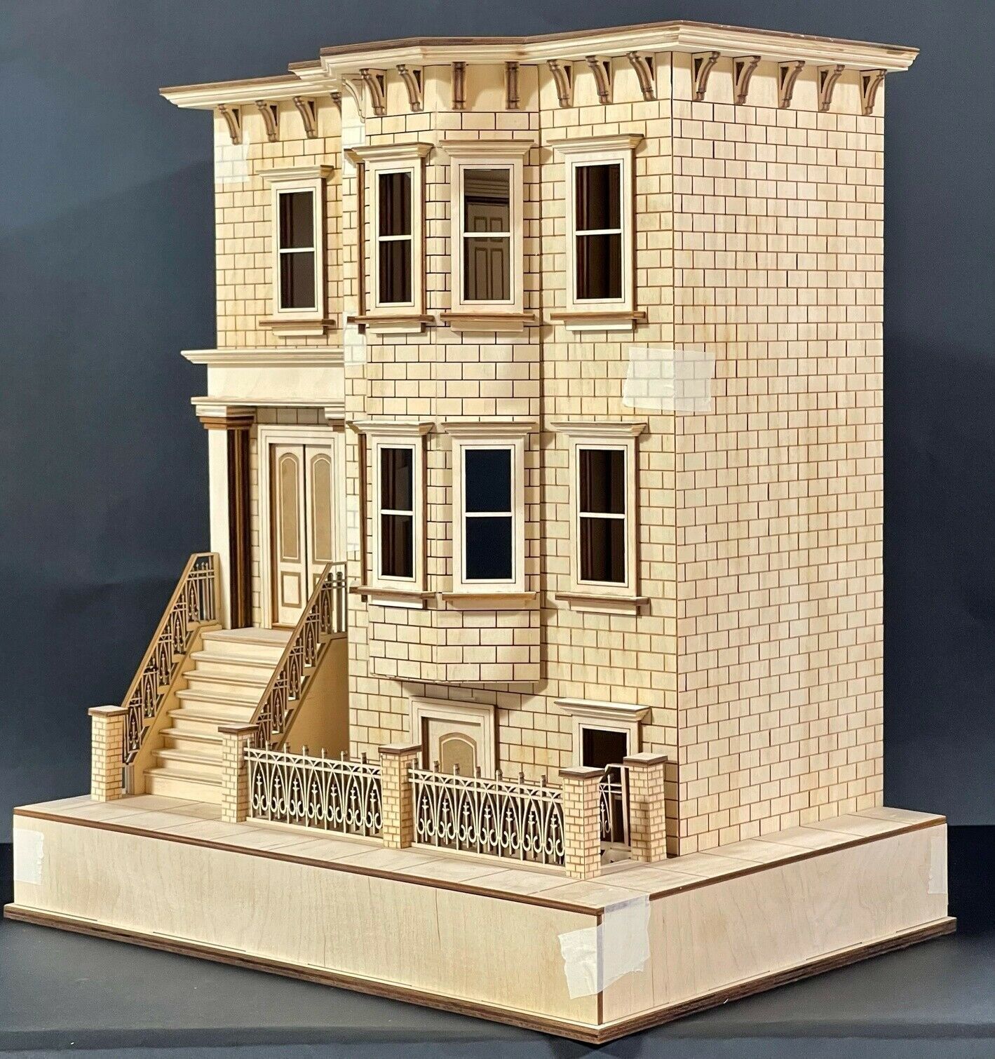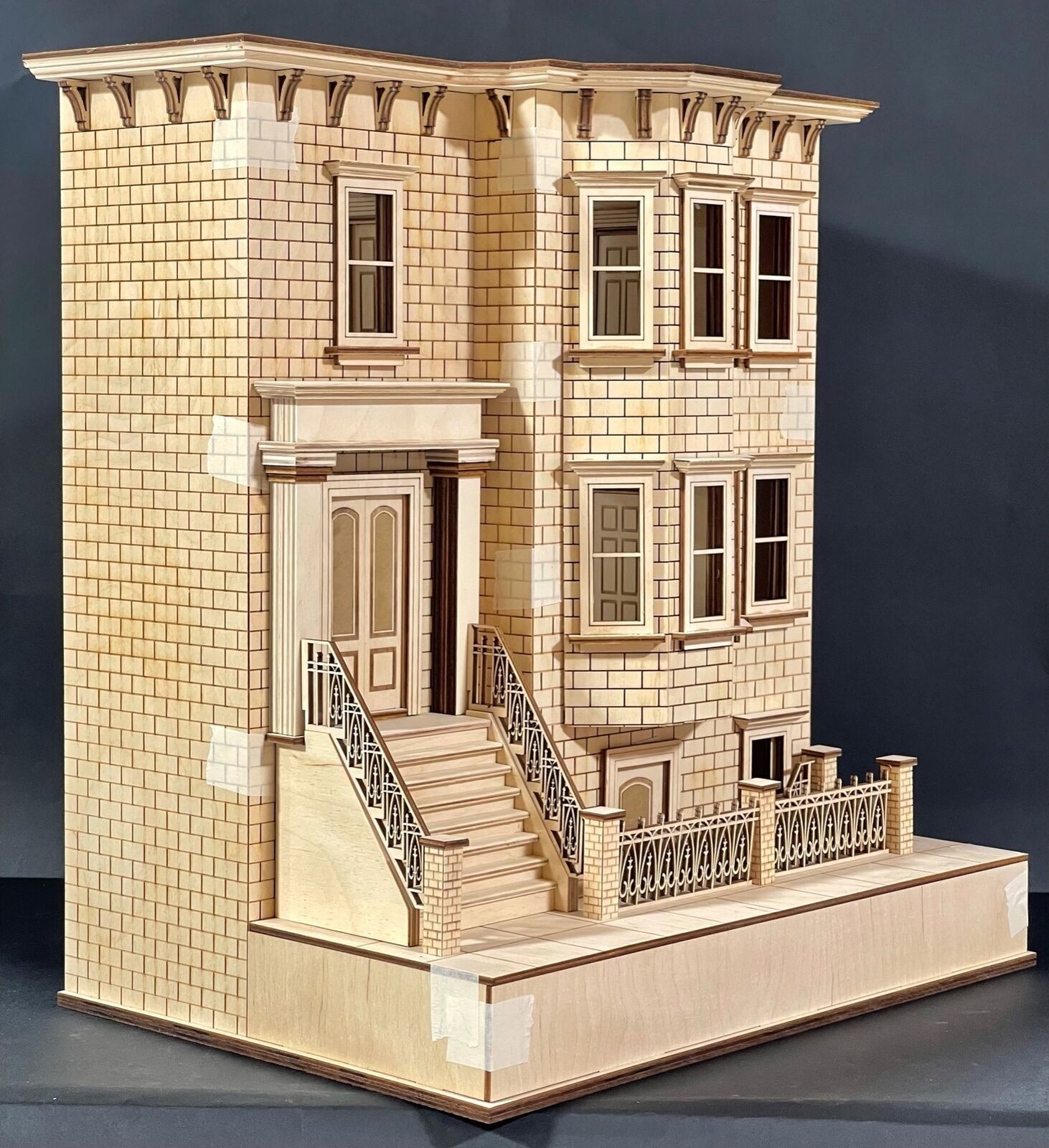Kit includes 5 working interior doors, detailed sidewalk with lower steps to basement, working main doors, detailed staircases, 10 windows, detailed brick exterior walls, fencing, stone pillars, and roofing with corbels.